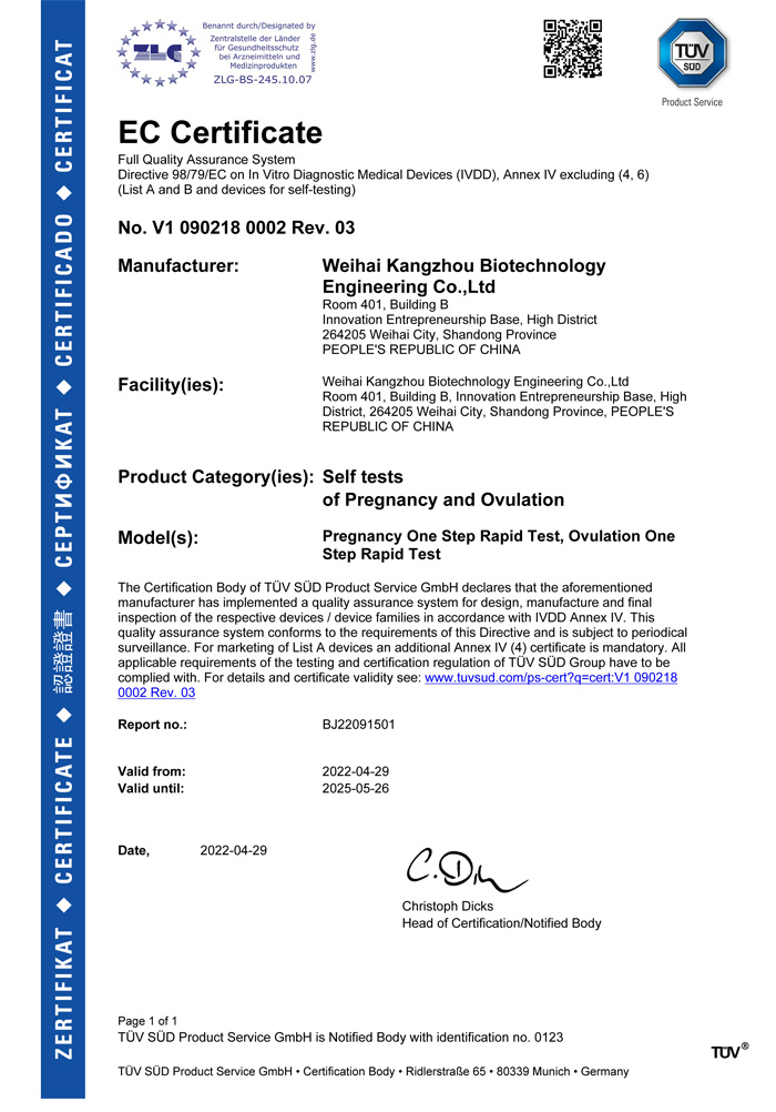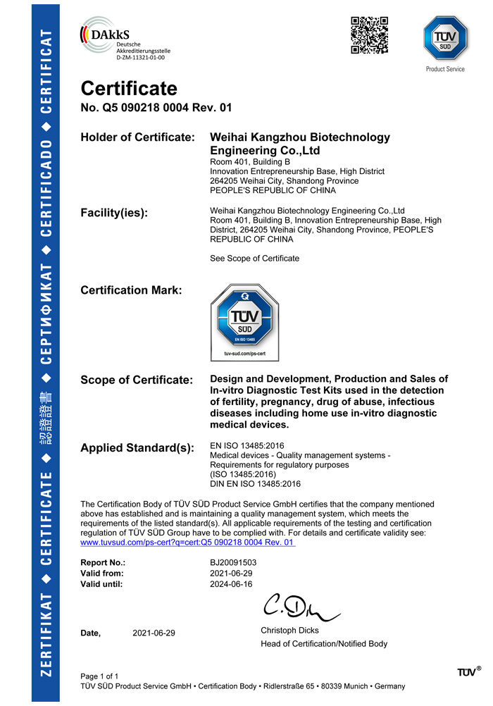? ? ?威海康州生物工程有限公司成立于2013年,公司坐落于風景秀麗的海濱小城——威海市。康州生物是集研發(fā)、生產和銷售于一體的生物科技公司,與威海哈爾濱工業大學合作研發(fā)團隊,擁有先進的科研基地及生產基地。主要從事快速診斷檢測產品的研發(fā)、生產、銷售。產品涵蓋:生育檢測、藥物濫用檢測、農藥殘留檢測以及其他臨床診斷檢測等。公司自主研發(fā)生產得早早孕試紙,排卵檢測試紙,毒品檢測及疾病檢測等醫用產品,經過歐盟認證,產品質量穩(wěn)定,值得信賴。